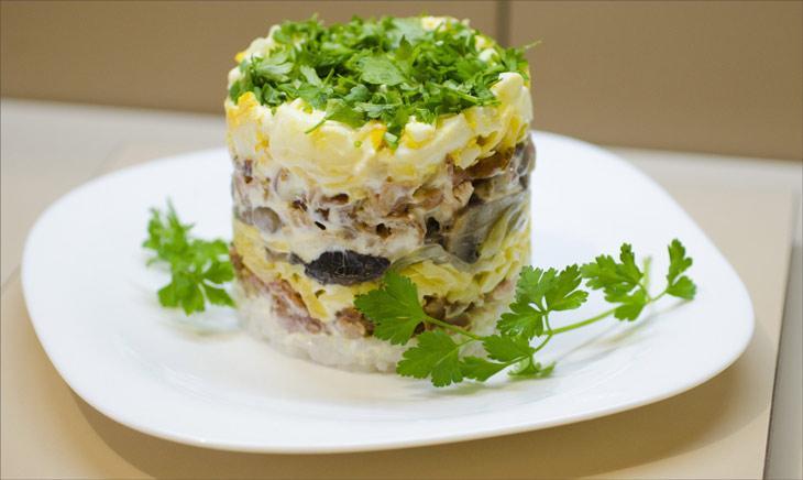 6. Завершающие слои выложите из курицы и обжаренных с луком грибов.